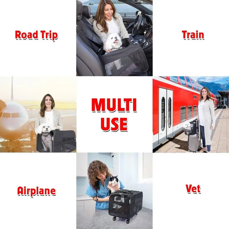 Pet Carrier with Wheels Collapsible Travel Bag for Dogs Cats Airline Approved Soft Sided Rolling Cart Removable Bedding Ventilated Foldable Lightweight